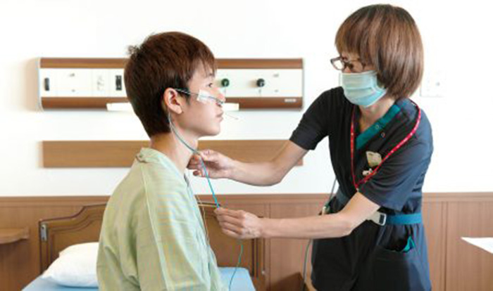 受診すると、まず喉や鼻に形態異常や腫瘍がないことを確認します。ある場合は手術、ない場合は自宅でできるスクリーニング検査となり、酸素濃度の低下、酸素飽和度の測定をします。この検査で無呼吸低呼吸指数が40以上なら、すぐに機器による治療を開始。20~40なら一泊入院での終夜睡眠ポリグラフ検査を行い、睡眠中の脳波や呼吸状態、血液中の酸素状態などを調べます。