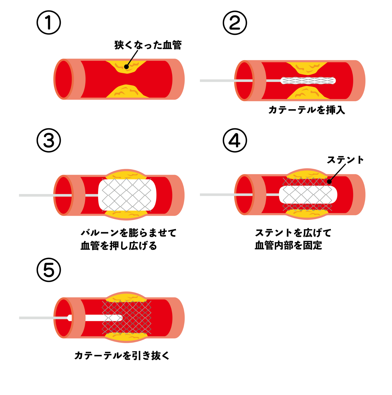 狭心症に対する心臓カテーテル治療・経皮的冠動脈形成術(PCI)の流れを図解します。